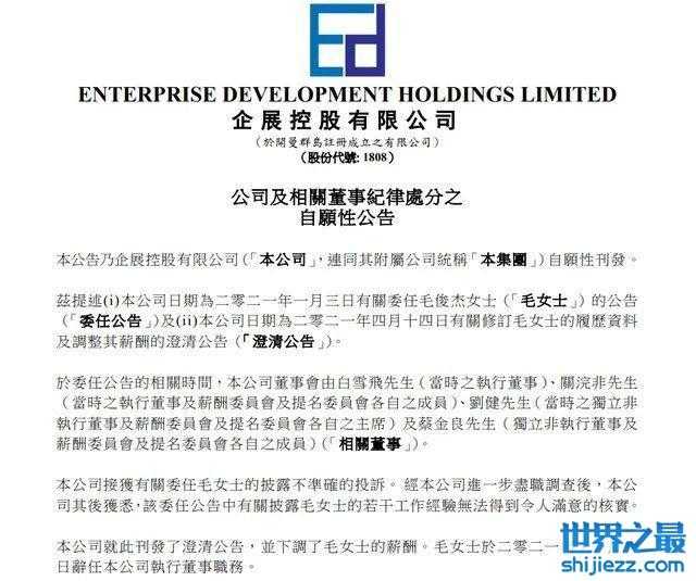 结果没多久,港交所就接到多宗投诉,均为质疑毛俊杰履历不实,有欠准确,对此,企展控股发布公告,下调毛的薪酬,而她本人已于去年辞职了。