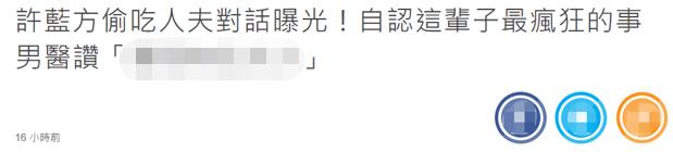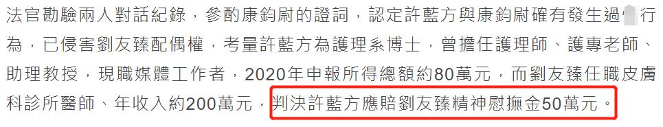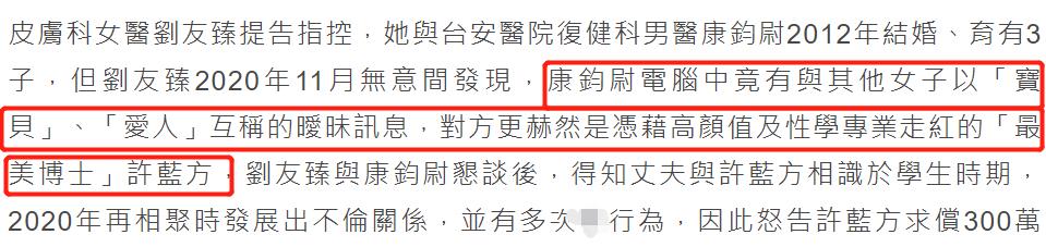 近日,台湾当红女星,有“最美博士“之称的许蓝方被控出轨他人丈夫,被对方正宫妻子要求赔偿300万台币,法院判决期间,许蓝方与他人丈夫的大尺度对话也遭曝光。引起了广大网民的热议。