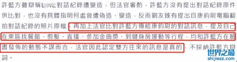 在许蓝方反驳称对话记录为伪造时,法官经过对比讯息中许蓝方提到的自己的直播、剪发、直播行程与她现实的行程都一一吻合。而许蓝方也并未能拿出任何证明对话记录是假的,实质性证据,因此法官认定对话讯息都是真的。