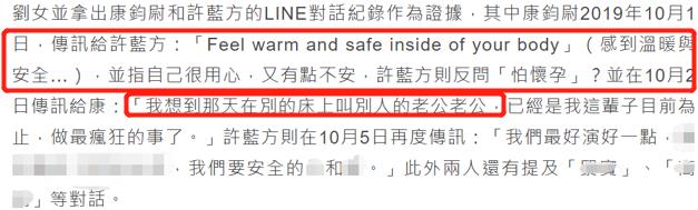 而男方妻子曝光的两人对话则更是大尺度,男方直接向女方传达了许多发生不正当关系时自己的体验,还指自己有点不安,许蓝方则是直接反问:“怕怀孕?”,并且还在之后发讯息给男方,称自己觉得叫别人的老公为自己老公是他这辈子最疯狂的事,表明其实许蓝方是知道对方已有家室的,此外两人讯息间还提到了许多大尺度的词。