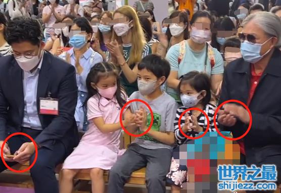 台上郭晶晶在温柔地给孩子们讲故事,台下霍家一家人也很是和谐友爱,为了给郭晶晶捧场,大家都穿得很正式,霍启刚跟霍震霆更是正装加身,显得很是精神。只见霍启刚在低头玩手机,霍震霆在一旁照顾小女儿霍中怡,两位小女儿都很是黏爷爷,看来平时霍震霆也经常照顾孙子孙女们。