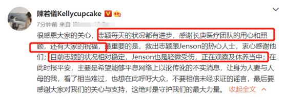 林志颖妻子陈若仪也在社交平台上公布了林志颖的最新消息,在此刻向网友报平安,表示林志颖每天的状况都在进步,目前林志颖的伤情也相对稳定,Jenson也是轻微受伤,正在观察和修养当中。陈若仪于此刻报平安,也是想要平息网络流言,希望各位网友不要以讹传讹。最后陈若仪还对支持他们一家的网友表示感谢。