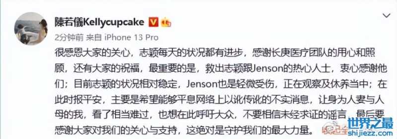 陈若仪:目前志颖的状况相对稳定,Jenson也是轻微受伤,正在观察及休养当中;在此时报平安,主要是希望能够平息网络上以讹传讹的不实消息,让身为人妻与人母的我,看了相当难过。也想在此呼吁大众,不要相信未经求证的谣言,最后要感谢大家对我们的关心与支持,这绝对是守护我们的最大力量。