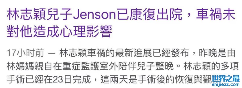 根据台媒24日发布的消息得知,林志颖的儿子Jenson由于受伤不严重,只是脸部有些轻微擦伤,目前孩子已经康复出院,由妈妈陈若仪将其带回了家安抚。