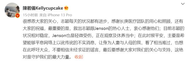 林志颖的老婆陈若仪看到那么多不实消息后也公开发声,表示希望能够平息网络上以讹传讹的不实消息,她透露志颖的状况每天都有进步,状况也相对稳定,Jenson也是轻微受伤,正在观察和休养,陈若仪感谢医疗团队的照顾和用心,谢谢大家的祝福,也谢谢救出林志颖和孩子的热心人士,希望大家不要相信未经求证的谣言。