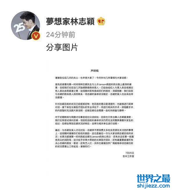 目前,林志颖入院治疗后已清醒,状况逐渐稳定,其工作室发文简述事件经过,感谢大家对林志颖的支持与鼓励,祝他早日康复。