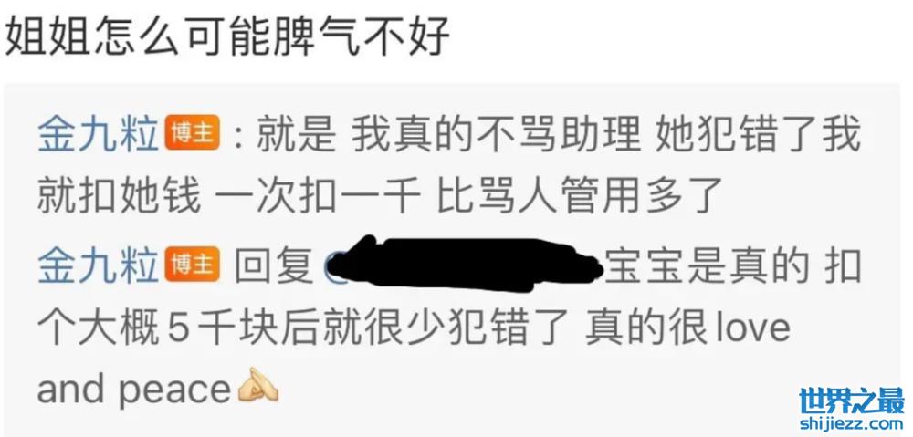 金靖回复道:“我真的不骂助理,她做错事我一次就扣她一千,比骂人管用多了。”