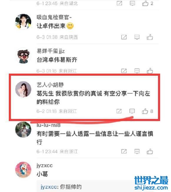 有意思的是,狗仔之前爆汪小菲的料时,小胡静就有在下面评论说:“葛先生,我很欣赏你的真诚,有空分享一下向佐的料给你”。