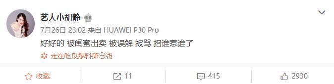 小胡静在两个社交账号都有发声:“好好的,被闺蜜出卖,被误解,被骂,招谁惹谁了”,最后她还忍无可忍,在评论区再次回复:“谁知道闺蜜出卖我,今天全是问我这个的”。