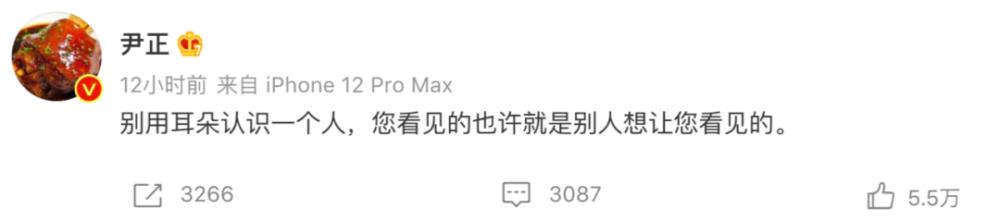 而尹正也被迫“卷入”这场风波,黄晓明恋情上热搜时,尹正发微博称“别用耳朵认识一个人,您看见的也就是别人想让您看见的”。尹正刚和黄晓明拍完综艺《中餐厅》。