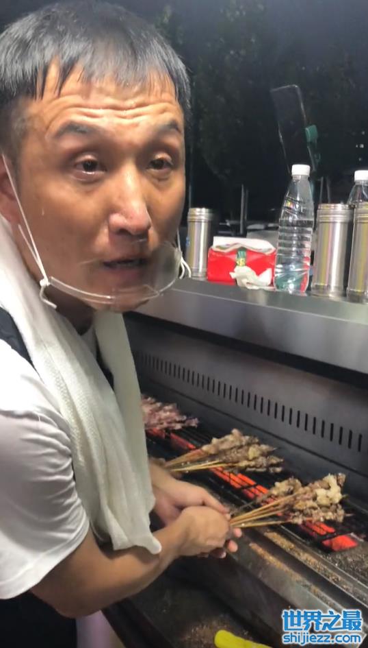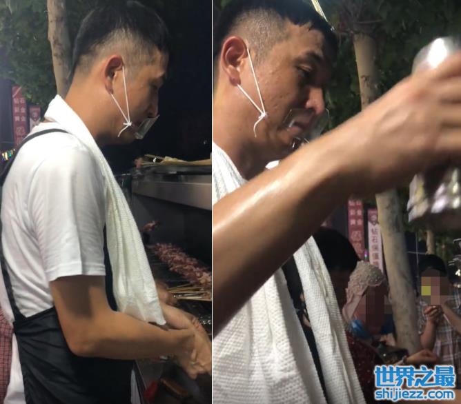 但即便是热到头发打绺,脑门上全是汗水,马赫也没有懈怠自己的工作,一边烤着手上的肉,一边还不忘问顾客的口味,全程敬业又认真。