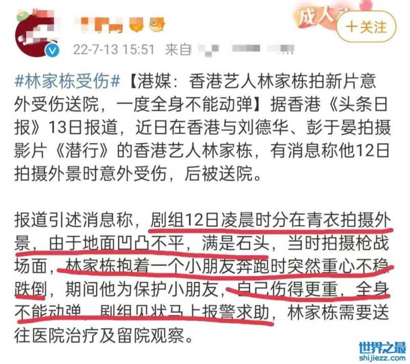 有人爆料称,7月12日凌晨,林家栋所在剧组《潜行》,在青衣拍摄外景时,有一场戏是林家栋抱着小朋友在奔跑,由于地面凹凸不平,林家栋在奔跑时突然重心不稳,为了保护小朋友,他伤得很严重,全身不能动弹,剧组见状立刻报警求助。