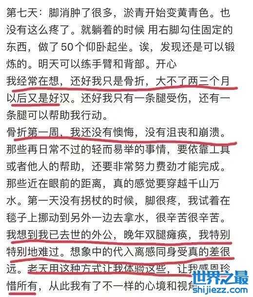 虽然意外受伤,但是何穗心态比较乐观,她并没有沮丧,详细记录了自己骨折一周的状况。幸运的是骨折没有移位,带支具保守治疗,不需要手术。另外,她还回想起外公晚年双腿瘫痪的场景,感恩现在所拥有的一切。