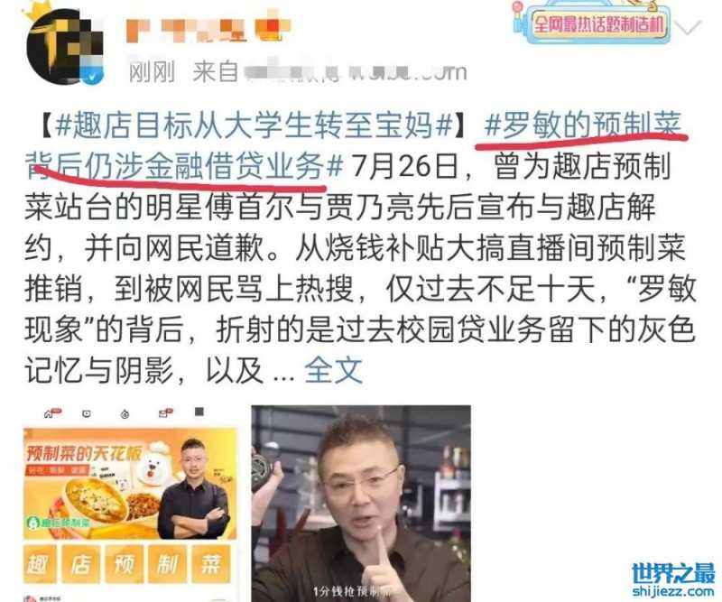 近日,贾乃亮与趣店罗敏直播备受争议。事情是这样的,这个罗敏是趣店集团的创始人兼CEO,也是“校园贷鼻祖”,曾经因校园贷坑了很多大学生,摧毁了不少家庭。如今又把目光放在预制菜上,被指收割完大学生,又来收割宝妈,瞬间引发众怒。