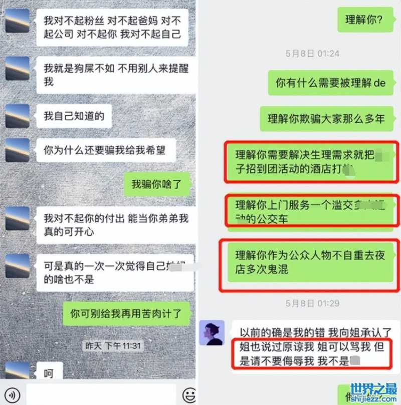 随后站姐还曝出了多张与丁泽仁的聊天记录,爆料表示丁泽仁不仅多次出轨,而且还在团活动期间,明知会有一大群粉丝来看他,他还在酒店为了解决所谓的生理需求和特殊工作者进行性交易。然而听到这些职责,丁泽仁显然知错不改,并表示让站姐不要侮辱他,他不是特殊职业者。