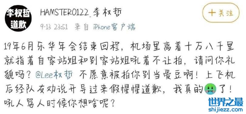 对于自家站姐,李权哲也全然没有体恤与感恩之心,19年乐华七子参加完年会后返程,在机场之际李权哲语气蛮横嘲自己与别家站姐吼着不让拍照,连起码的礼貌都没有。