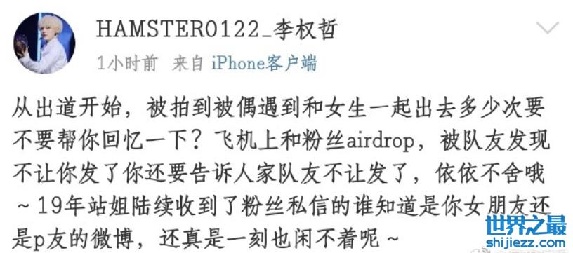更让人震惊的是,李权哲私下态度极为傲慢,还一度与队友炫耀,自己与异性约会之间的私事,更有网友爆料,李权哲甚至在飞机上还不忘与粉丝投送异性照片。