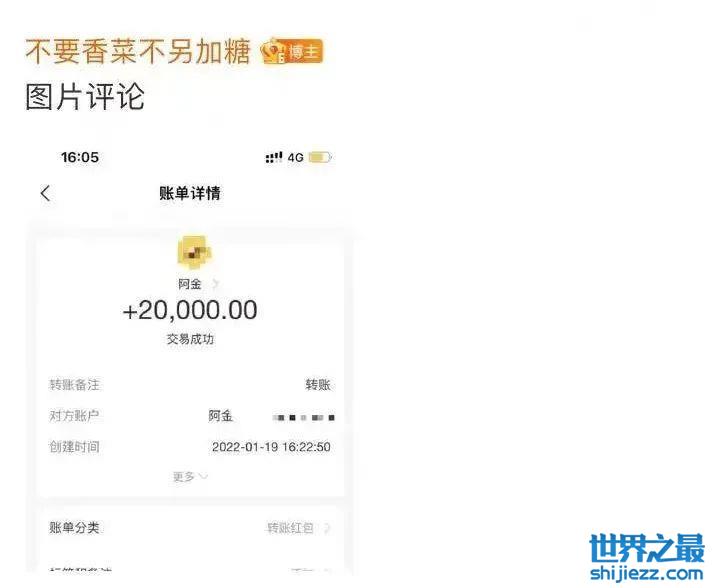 并且还晒了金靖给她发三万年终奖的转账截图,