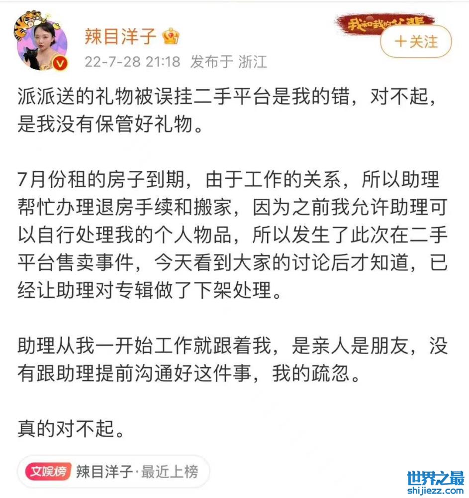 因为被闹大,辣目洋子发文道歉了,解释说是7月份搬家的时候,由于工作原因,允许助理处置自己的私人物品,却因为没有好好沟通,才发生了二手平台售卖事件,看到讨论后,就及时下架了。