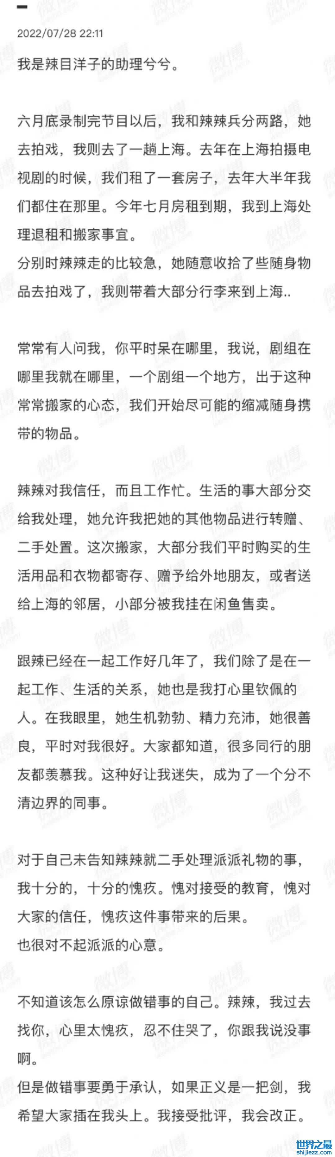 但辣目洋子的助理兮兮出来回应了,说确实是自己转卖礼物时没有告知辣目洋子,“如果正义是一把剑,我希望大家插在我头上。”