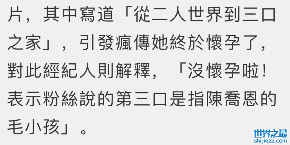 就在大家的祝福与猜测中,媒体联系到陈乔恩的经纪人,对方否认陈乔恩怀孕,表示粉丝说的三口之家指的是陈乔恩的毛小孩,她的宠物小狗。