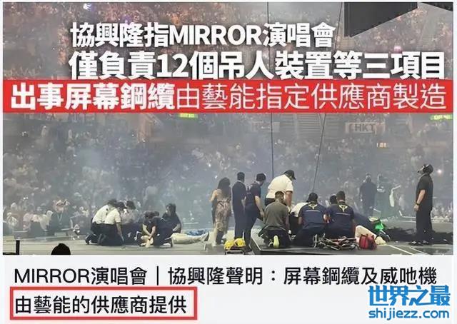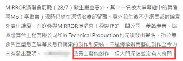 意外发生后,不少网友都讨论这场意外谁该负主要责任,目前知道参与Mirror演唱会舞台工程制作的有三家公司,分别是菱艺广告、协兴隆和ITP,但三家公司都先后发出声明,澄清没有参与大屏幕的制作与安装,也就是否认与屏幕下坠意外有关。