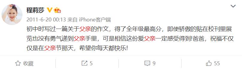 11年前,程莉莎曾发文,说自己写过一篇关于父亲的作文,得了全年级最高分。程莉莎今日的优秀,离不开父亲的宠爱,也能理解程莉莎为什么不顾“戏比天大”,也要第一时间回去看父亲,因为在程莉莎那里,父亲才是最重要的。