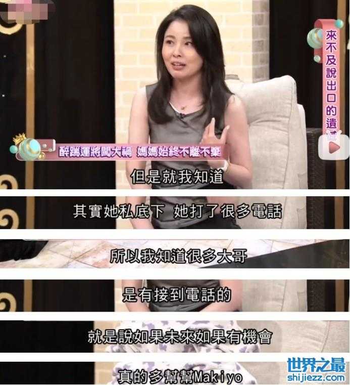 回到家她听到Makiyo姐姐骂她,她妈妈也会帮她怼回去。在自己癌症已经很严重,接近生命尾声的时候,Makiyo的妈妈还会陪她去各地工作;甚至又上了一回康熙,现场来了一场托孤。