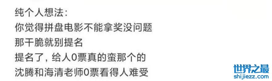 不过也有网友认为,沈腾这次是凭《我和我的父辈》入围的,这种拼盘电影相较其他几部主流电影,的确不算太亮眼,但既然入围了,给0票这种尴尬行为,真不如不提名了。