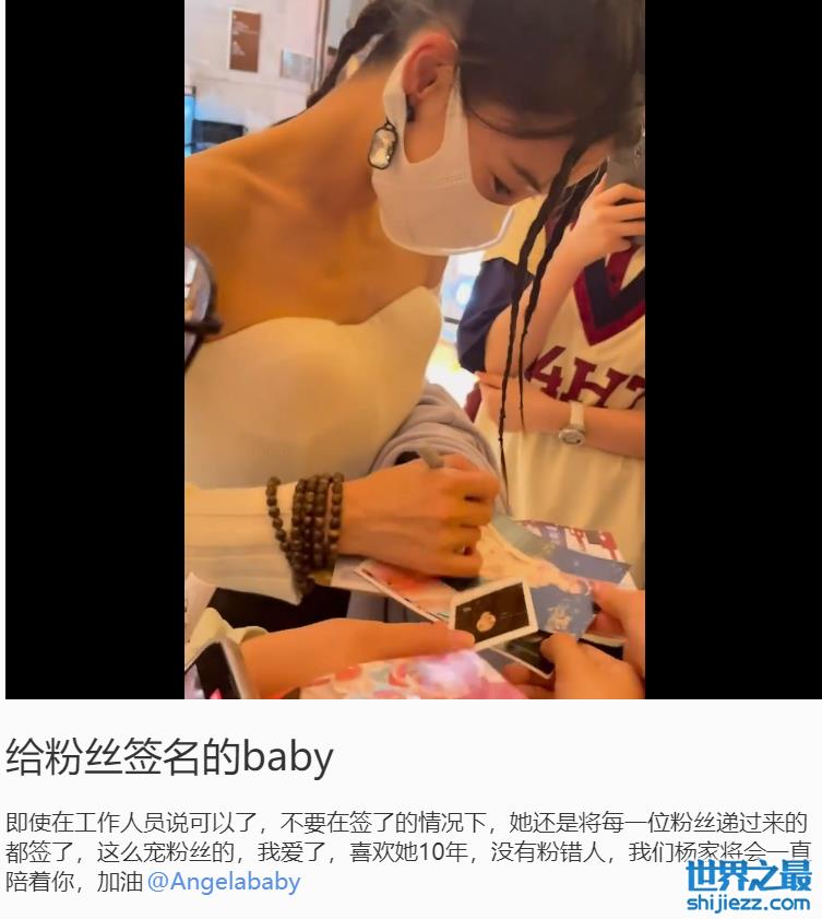 面对喜欢自己的粉丝,angelababy也丝毫没有大明星的架子,对于大家拿来的照片也是纷纷签名。尽管有工作人员催促她,但其依然坚持为每个粉丝都签了名,有不少网友称赞她身上很香,身材超赞,baby非常暖心的对大家表示感谢。