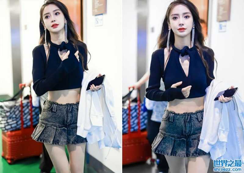 而在晚些时候,有网友拍到了baby最新的路透照片。当时的她已经换了一身打扮,但却依旧火辣,穿着一条牛仔超短裙搭配黑色露脐上衣,盈盈细腰不堪一握,皮肤白到发光,整个人状态在线又美又酷。