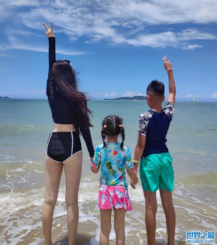 即将15岁的玫瑰身高已经超过妈妈,穿着一身黑色的修身泳衣,一头秀发随风飘扬,与弟弟妹妹牵手拍的背影照中可以看到玫瑰的腿非常长,与弟弟赵子龙的肤色形成了鲜明的对比,又白又直的大长腿,十分吸睛。