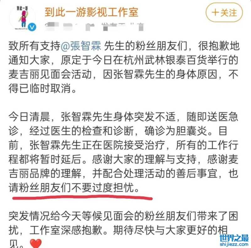 从张智霖工作室,张智霖官方后援会的声明来看,张智霖因身体不适,取消活动,后去医院检查,最终确诊胆囊炎。