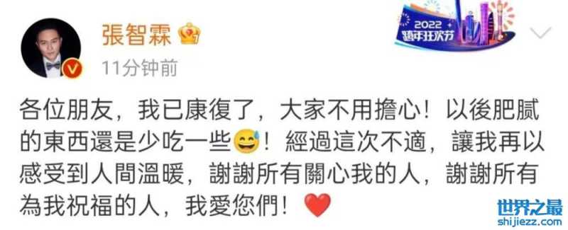 之后,张智霖在8月1日晚上发文报平安,称自己已经康复了,感谢大家的祝福,还表示以后要少吃肥腻的东西。