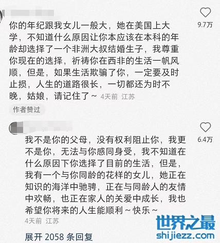 不过网友们却并不是很放心她就这样和一个远在地球另一端的黑人男子走了,因此还有评论劝她思虑周全。
