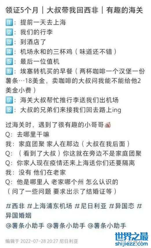 在7月28日的时候,“周周在西非”挺着大肚子,跟着领证五个月的西非老公回西非去了,文字间看得出来她相当期待新的生活。