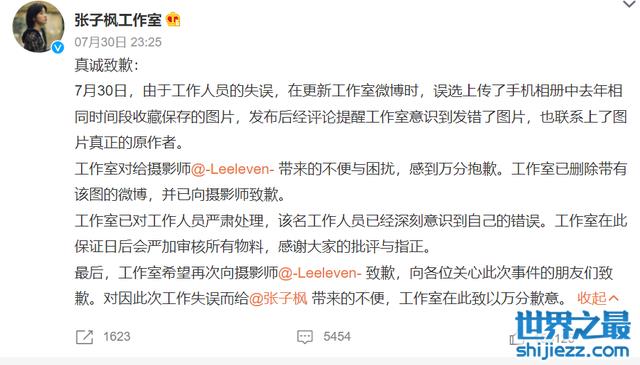 于是,她的工作室火速把照片删除。随后便立刻发了一通紧急声明,将沙包丢给了自家工作人员——工作人员失误上传了去年相同时间段保存的图片,已经删除了照片,并联系真正的原作者道歉了。