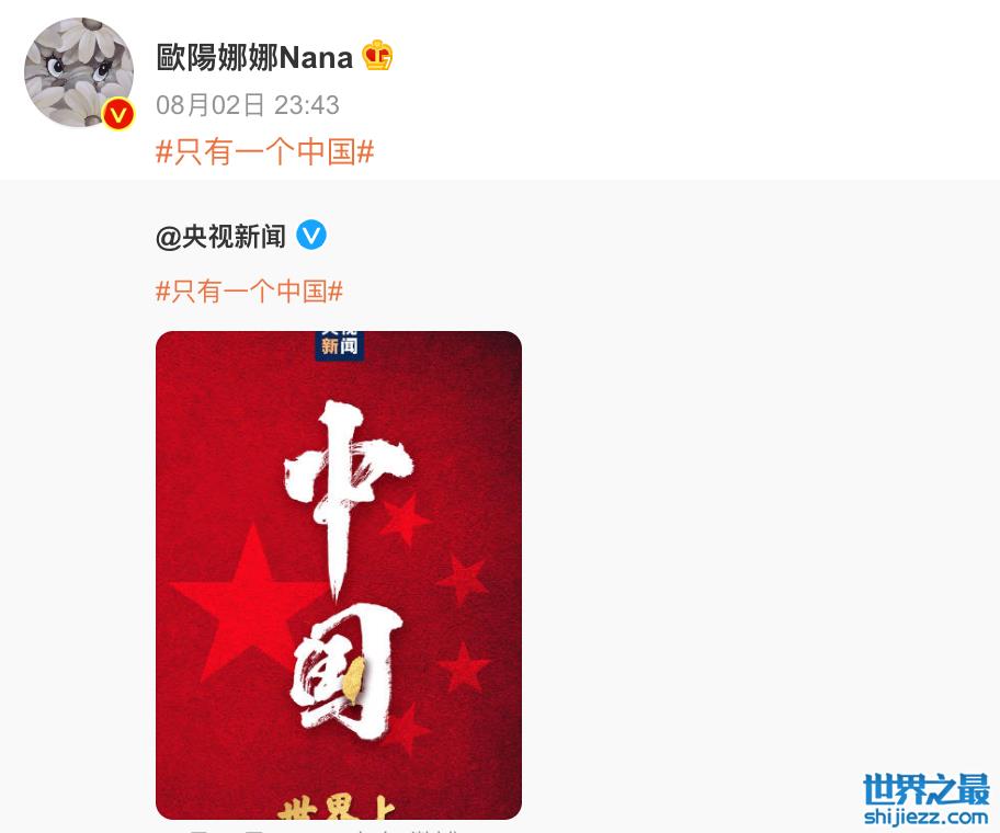 2日晚,央视新闻发布微博“只有一个中国”,明星纷纷转发。其中,台湾艺人欧阳娜娜、赖冠霖、陈立农、林彦俊、文淇、王大陆都在第一时间转发了。