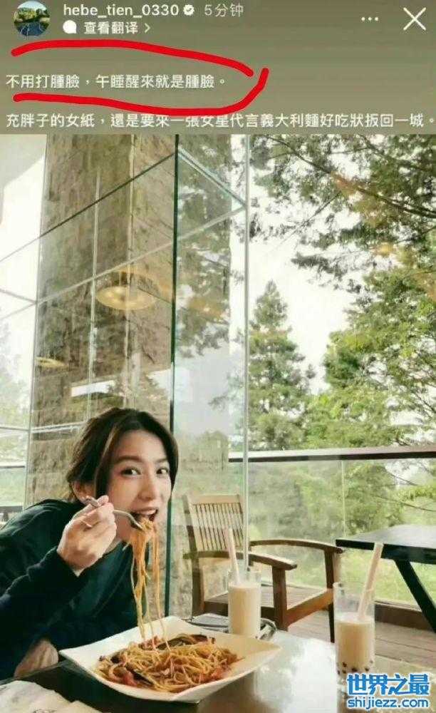 一条是她在吃意大利面的照片,配文:不用打肿脸,午睡起来就是肿脸。充胖子的女纸,还是要来一张吃意大利面好吃状扳回一局。