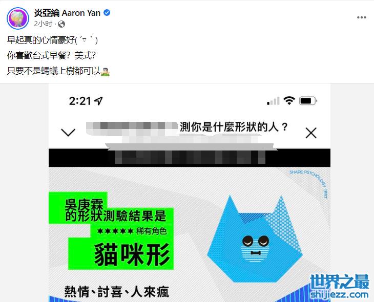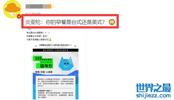 然而有两位艺人的发言却引发争议,其中一位是炎亚纶,在8月3日一早,炎亚纶在外网发布一条有关吃早餐的动态,然而他的配文却是“早起真的心情好好,你喜欢台式早餐?美式?只要不少蚂蚁上树都可以”,炎亚纶还配了一张测试的图片,显示他是猫咪形的性格,热情、讨喜、人来疯,喜欢沉浸在欢快的氛围中。