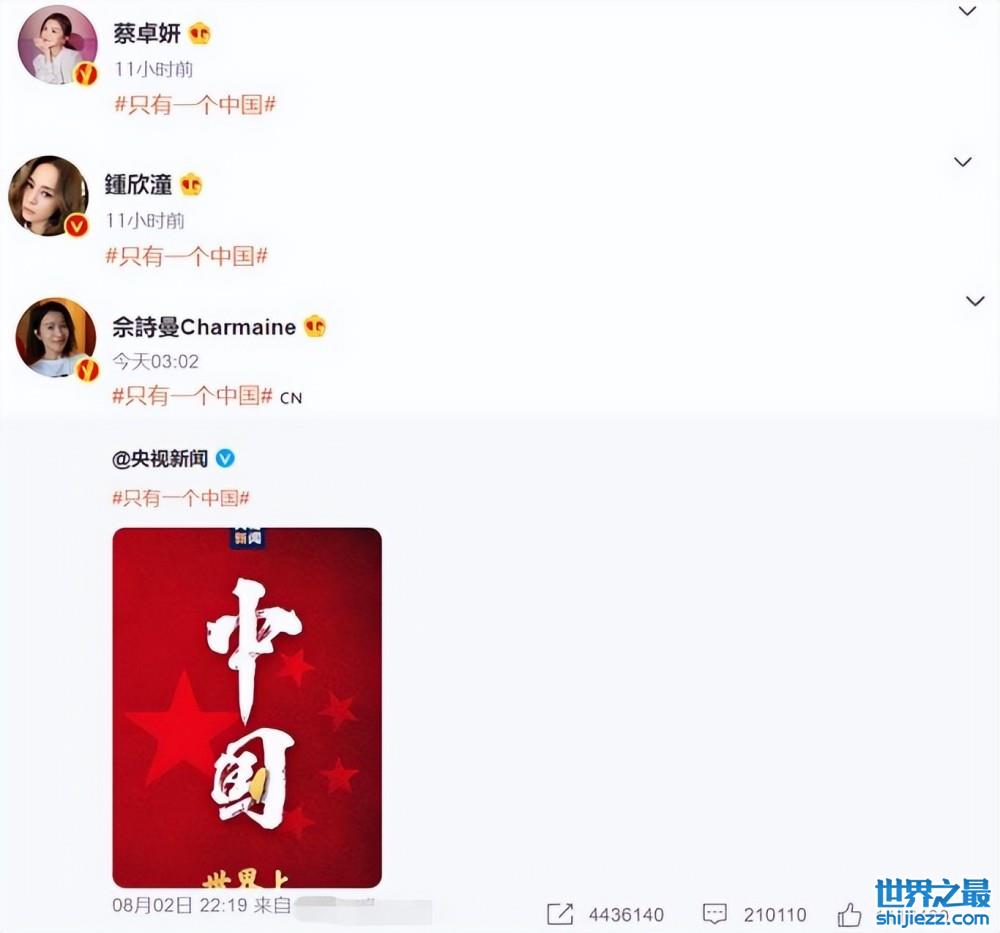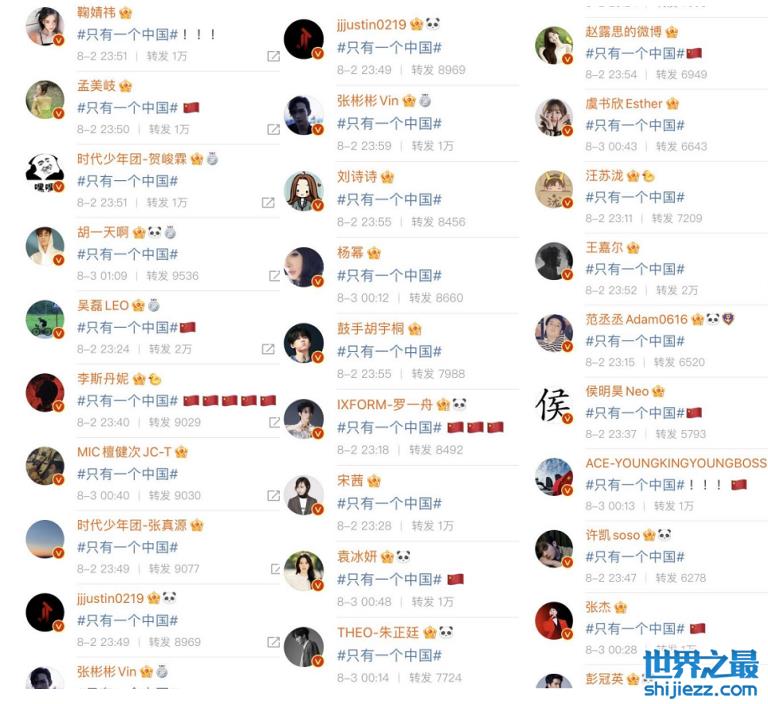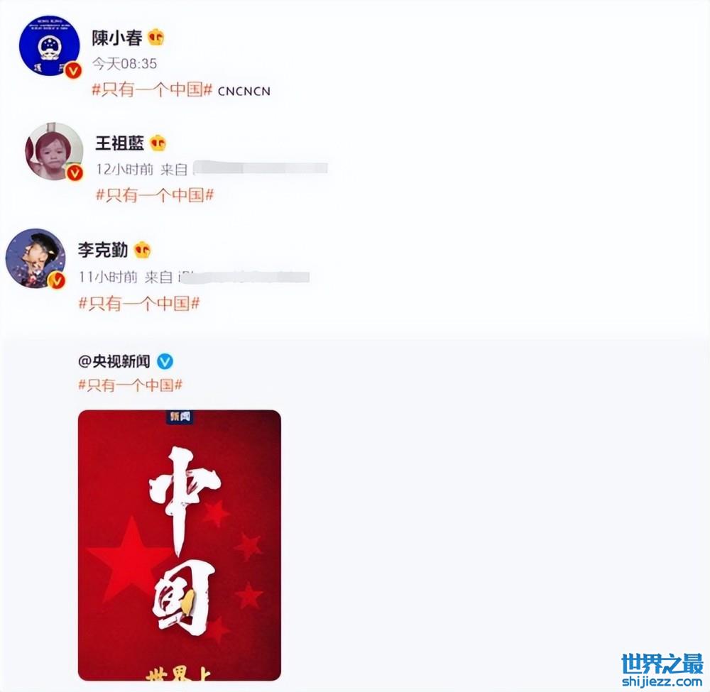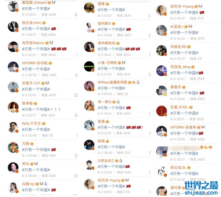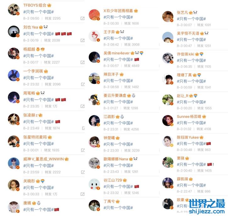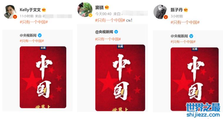 圈内的艺人们也在社交平台上第一时间转发了“只有一个中国”的话题词,表达出了自己的态度。