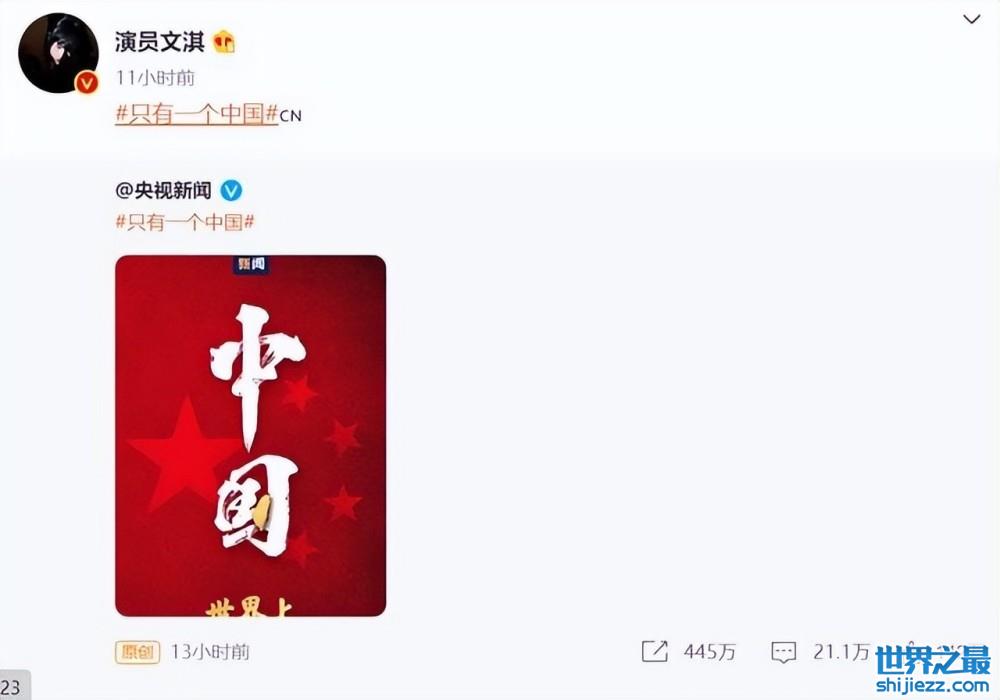 台湾女演员文琪也是第一时间转发了该条推文,并且配文“CN”,体现了其坚定的爱国信念。