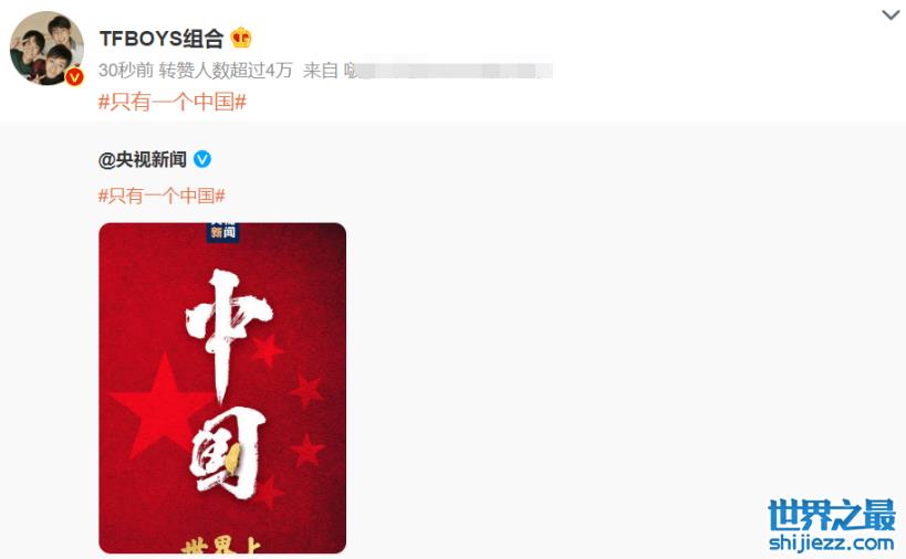 就连久未发动态的内地偶像组合tfboys都及时转发了央视新闻的“只有一个中国”立场,表明了自己的坚定决心与坚持“一个中国”原则的观点。