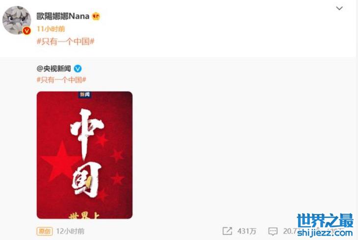欧阳娜娜更是首当其冲第一时间就转发了该条推文,体现了台湾是中国不可分割的一部分的坚定立场。