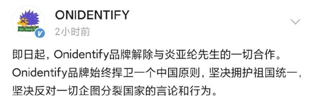 在此情况下,与炎亚纶相关的品牌官微发布动态,声明始终捍卫一个中国的根本原则,并宣布与代言人炎亚纶解约。
