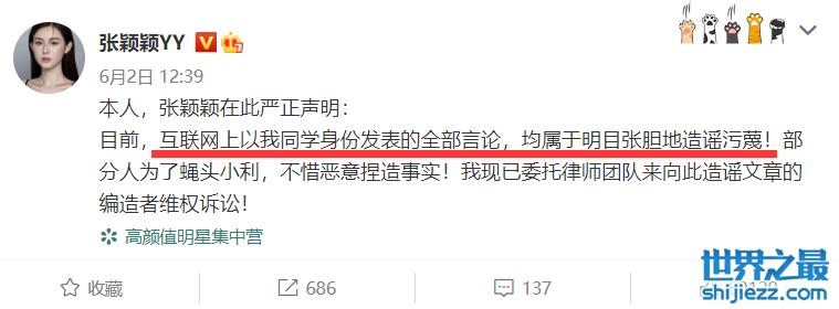 后来,张颖颖连发三条博文,称该网友造谣污蔑自己。并直接列出微博用户“素颜7252”发布的内容诋毁她的人格,损害了她的声誉,内容严重失实等等。