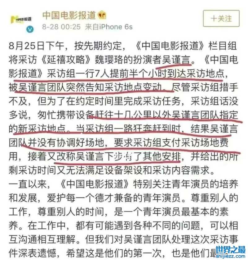 通过《延禧攻略》走红后,吴谨言获得了超高关注度,一众媒体争相采访她,央视也不例外。然而,官方却点名批评她耍大牌,从文中来看,吴谨言及其团队突然改变采访地点,等工作人员赶到后,他们又说有其他安排来不了,甚至要求采访组支付场地费用。