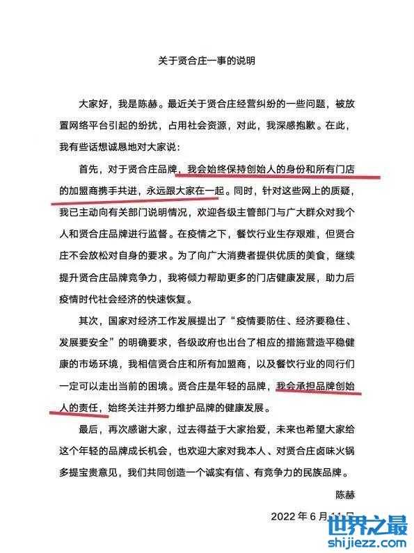 不知是不是巧合,在该女子举报前不久,陈赫就宣布退出贤合庄股东了。于是,很多人都说他“割完韭菜跑路了”。之后,陈赫发布声明,称自己将以创始人的身份与加盟商一起前进。眼尖的网友发现,陈赫声明只说了创始人,全然不提股东,他给自己留了很多后路。