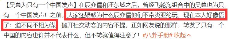 而且飞轮海的另外两位成员吴尊、汪东城也都转发了“只有一个中国”的动态,这样对比一下,也只有炎亚纶的立场有问题,还在这关键时期发表有关“台式美式早餐”的内涵动态。