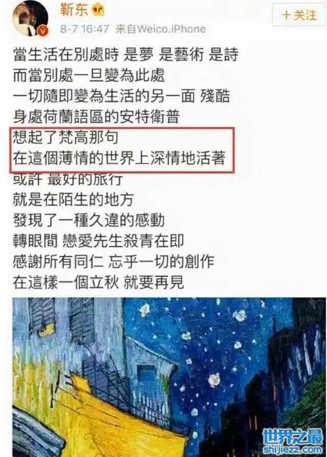 不仅如此,靳东还喜欢引用名言名句。剧组杀青,发段告别的话也没什么。但是他偏偏乱用名人名言。尴尬的是,梵高并没有说过这句话,(梵高心想,你还是放过我吧)真是把网友都逗乐了。